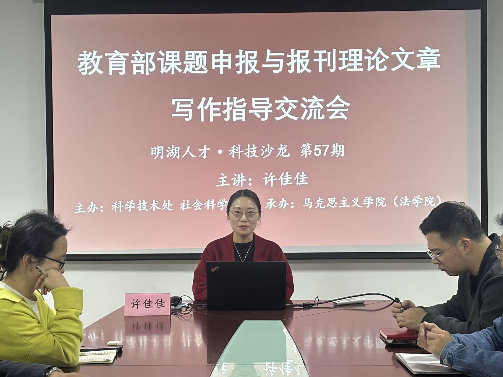 为进一步提高教育部人文社科项目申报质量,提升教师报刊理论文章写作水平,11月12日,由科技处主办、马克思主义学院(法学院)承办的“第57期明湖人才·科技沙龙——教育部课题申报与报刊理论文章写作指导交流会”在马克思主义学院(法学院)511会议室举办。活动特邀南京艺术学院马克思主义学院许佳佳老师做《关于教育部课题申报与报刊理论文章写作的几点心得》的专题指导,学院全体青年教师参加讲座。讲座由马克思主义学院(法学院)副院长沈妉主持。
