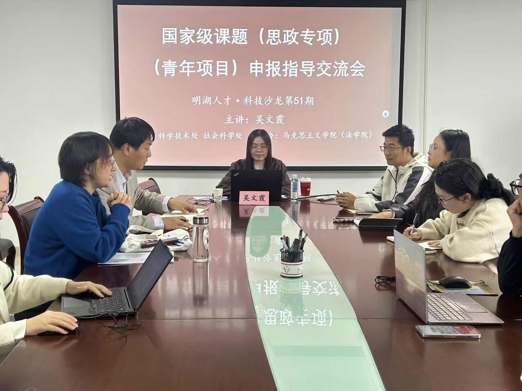 为进一步提升学院教师科研能力与学术水平,提高2026年国家社科基金项目、教育部人文社会科学研究项目申报质量,10月22日下午,由科技处主办、马克思主义学院(法学院)承办的“第51期明湖人才·科技沙龙——国家级课题(思政专项)、(青年项目)申报指导交流会”在马克思主义学院511会议室顺利举行。活动特邀安徽大学马克思主义学院吴文霞老师作专题指导,马克思主义学院(法学院)副院长沈妉主持,学院全体教师参加。