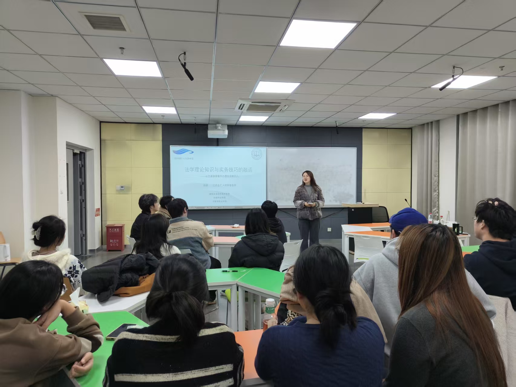 为提升法学专业学生实践能力,深化实践型法学教育机制创新,马克思主义学院(法学院)于12月1日在尚真楼201智慧教室,依托《刑事法律诊所》课程举办2025年“锡事明理”人文社科讲堂首场活动,特邀江苏金汇人律师事务所孙婷律师担任主讲。法律系主任简筱昊主持活动,2023级法学专业全体学生参加。