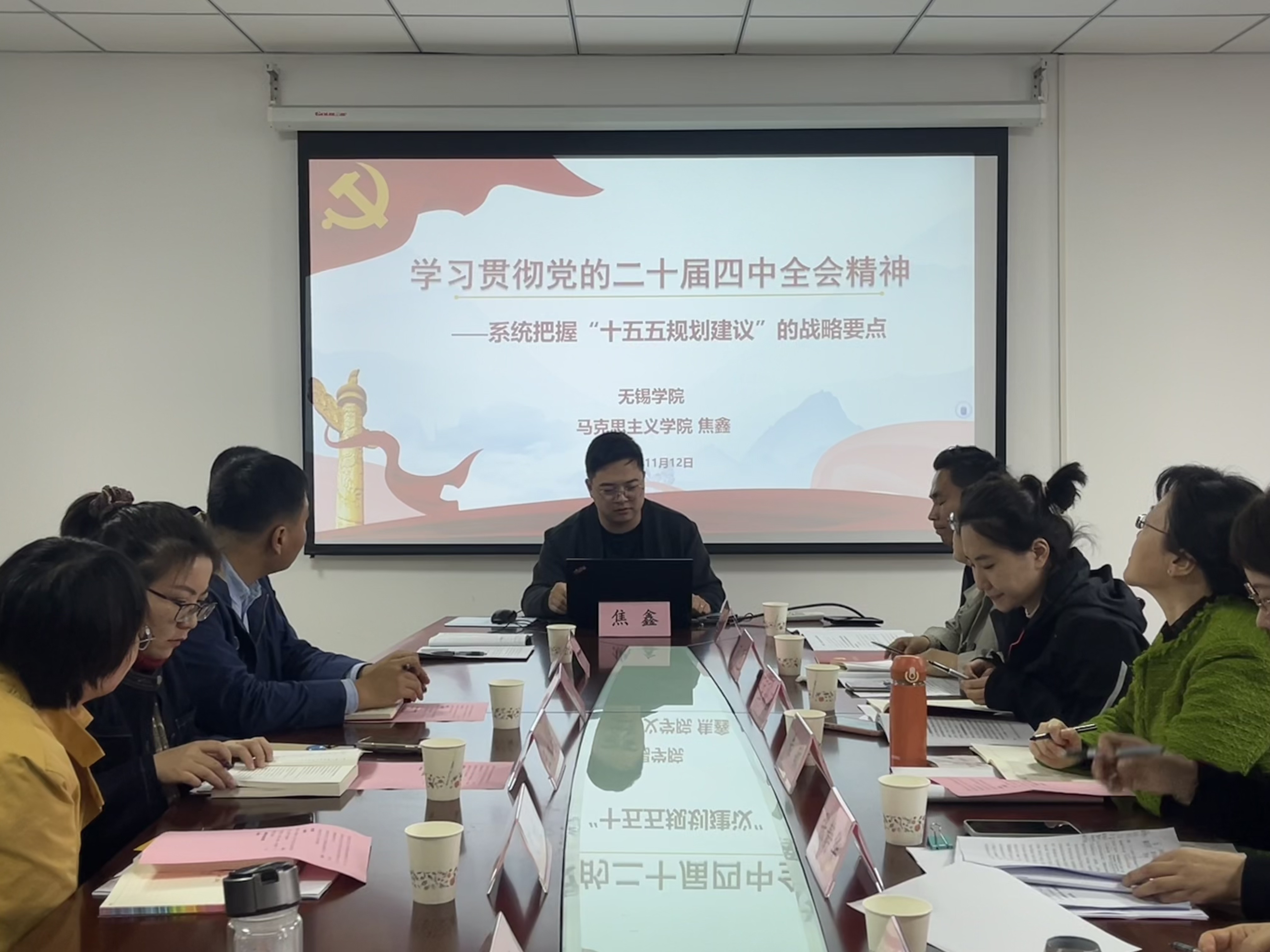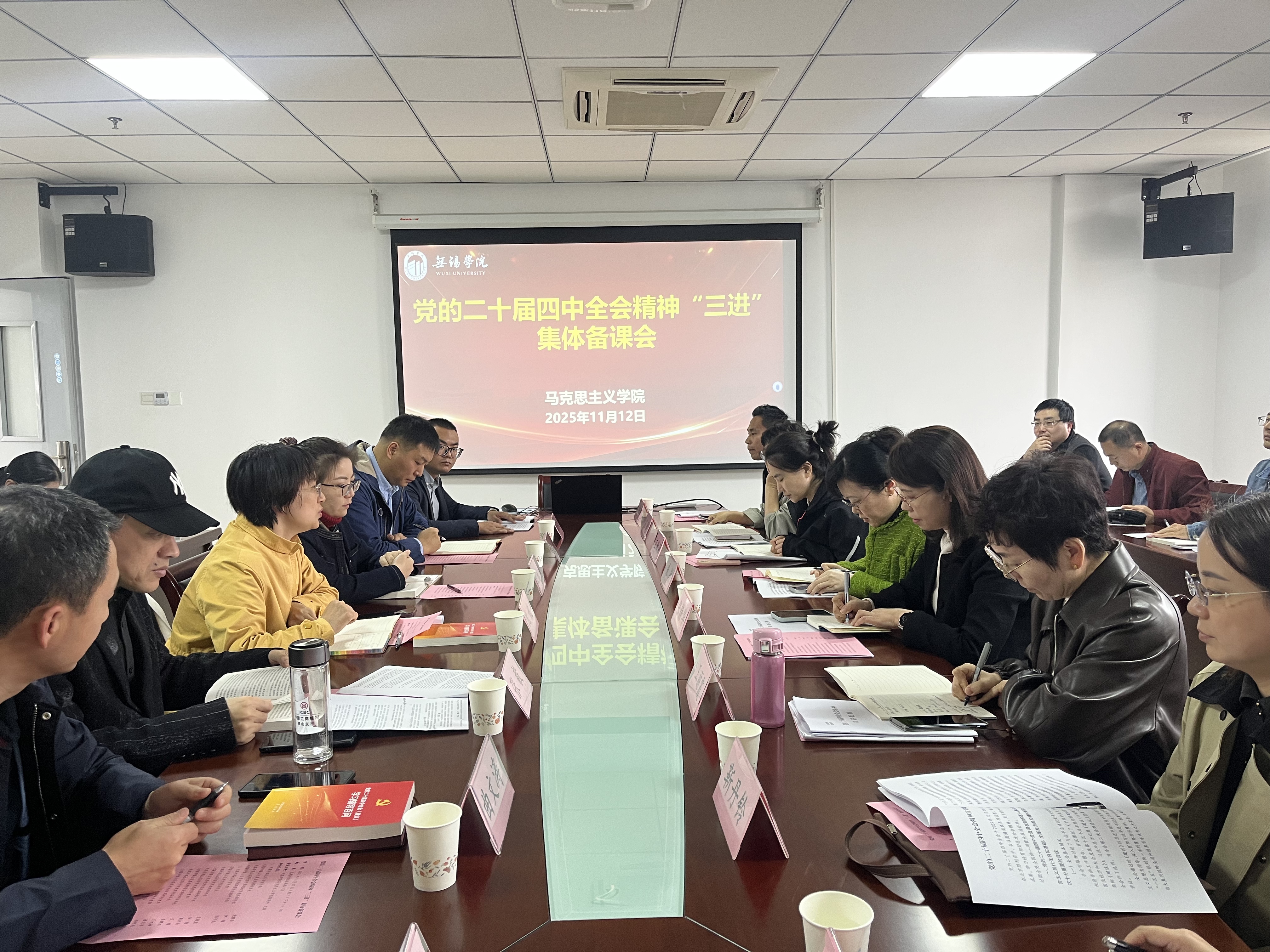 11月12日,马克思主义学院举办党的二十届四中全会精神“三进”集体备课会。无锡市锡山区委宣传部、锡山区委党校相关负责人与学院全体教师齐聚一堂,围绕把党的二十届四中全会精神融入课堂教学与基层宣讲展开讨论。会议由马克思主义学院副院长沈妉主持。