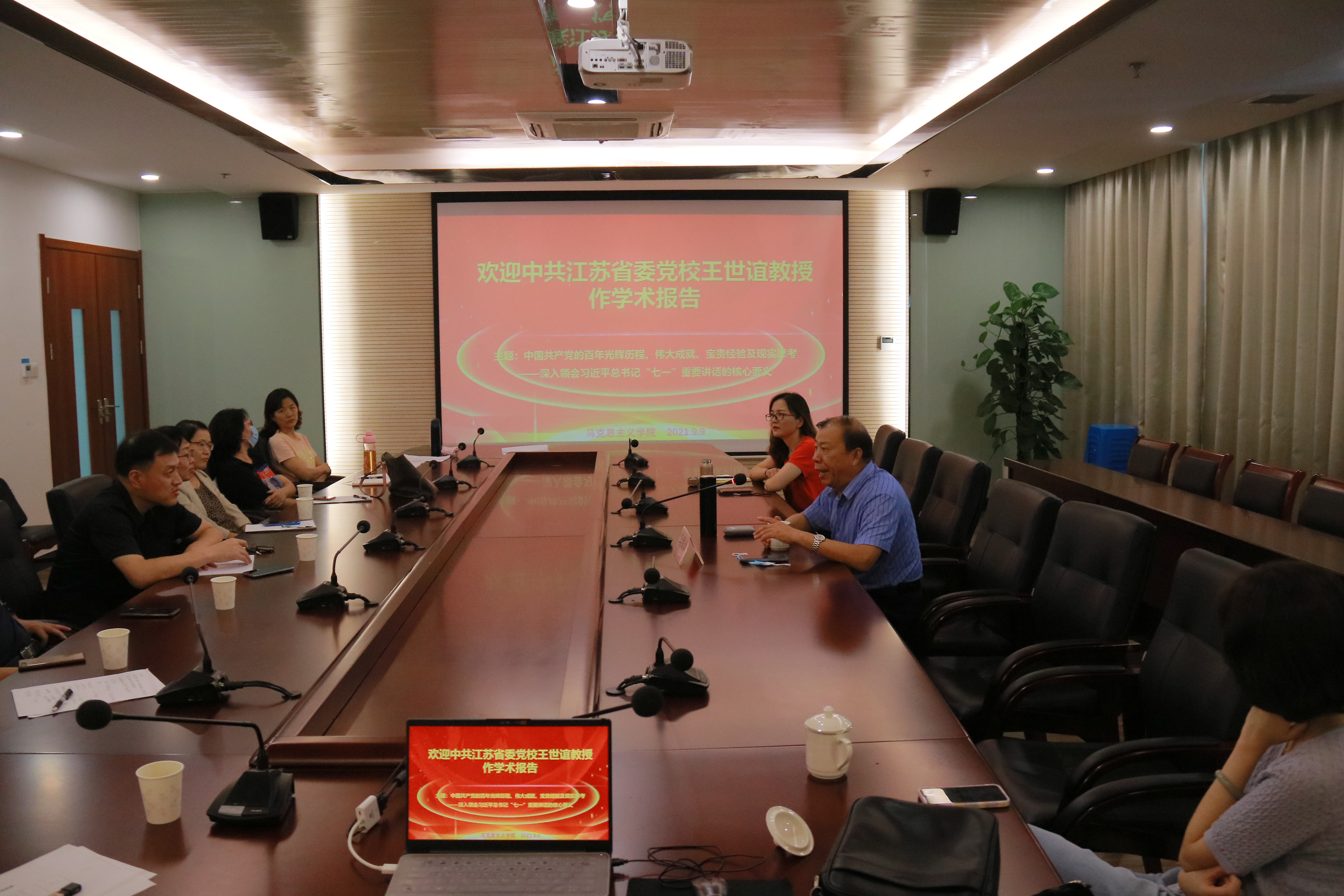 为深入解读习近平总书记“七一”重要讲话的核心要义,感悟中国共产党百年历程的伟大成就和宝贵经验,9月9日下午,马克思主义学院在行政楼401会议室举办专题专家报告,本次讲座特别邀请了中共江苏省委党校王世谊教授主讲,马克思主义学院副院长王玉萍主持讲座,全体教师参加了本次活动。
