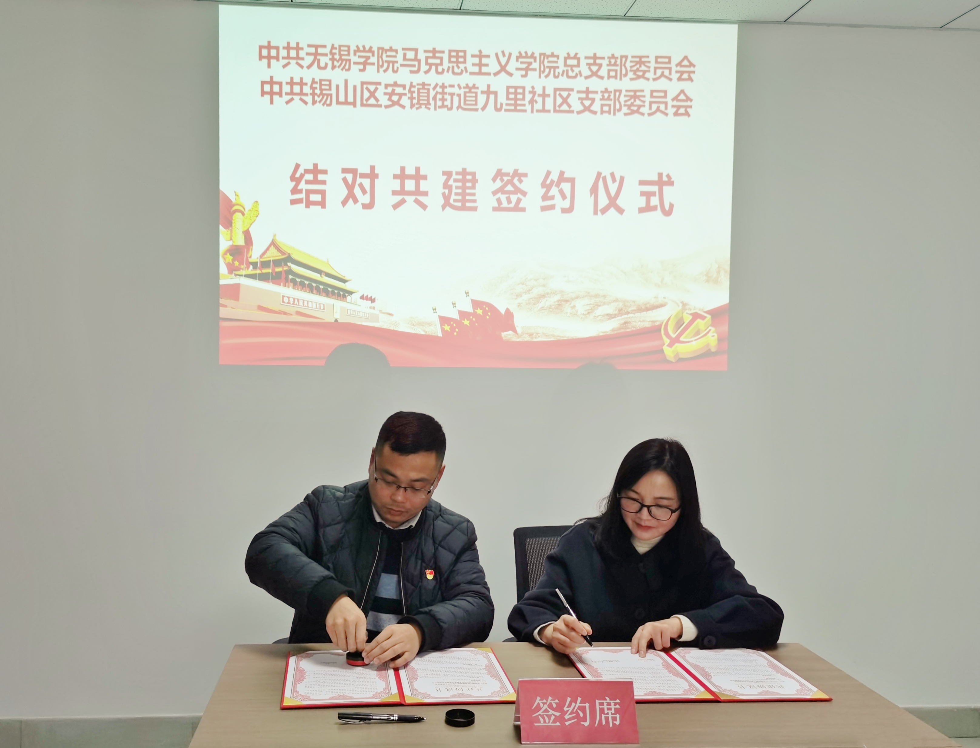 为了深入贯彻落实十九届六中全会精神,打造高校与社区共建共治共享新局面。1月6日上午,马克思主义学院与九里社区结对共建签约仪式在九里社区党群服务中心举行。无锡学院党委宣传部负责人程艳丽、马克思主义学院负责人王玉萍、专业系主任张毅、沈妉老师参加此次活动。
