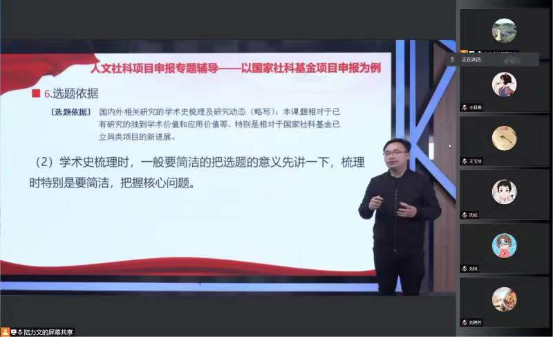 接下来的学习会上,全体教师在线收看了云南开放大学马克思主义学院副院长欧文辉教授所作的关于“人文社科项目申报专题辅导——以国家社科基金项目申报为例”的辅导报告。欧教授从申报的前期准备,如何写好申报书两个方面全面系统阐述了项目申报的步骤、要点、技巧和策略。同时,欧教授还结合国家社科基金项目申报的具体案例,就申报书中每一个板块填报给出了指导意见。