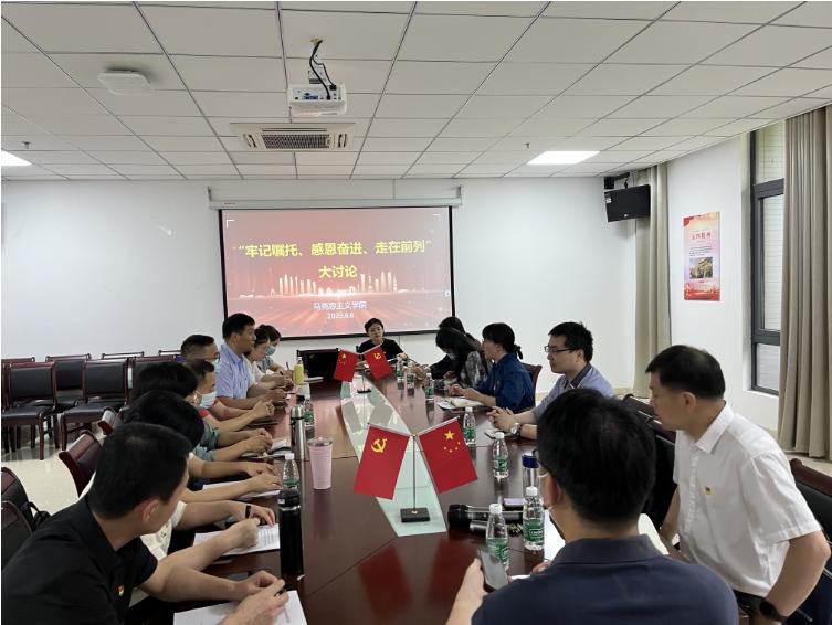 学思贵在用,知信重在行。为深入推进学习贯彻习近平新时代中国特色社会主义思想主题教育,扎实开展集中学习研讨,6月8日,马克思主义学院组织全体党员、思政课教师召开“牢记嘱托、感恩奋进、走在前列”大讨论,进一步聚焦“学思想、强党性、重实践、建新功”的总要求。副院长沈妉、教工党支部书记曲文涛作重点发言,其他党员教师交流发言。