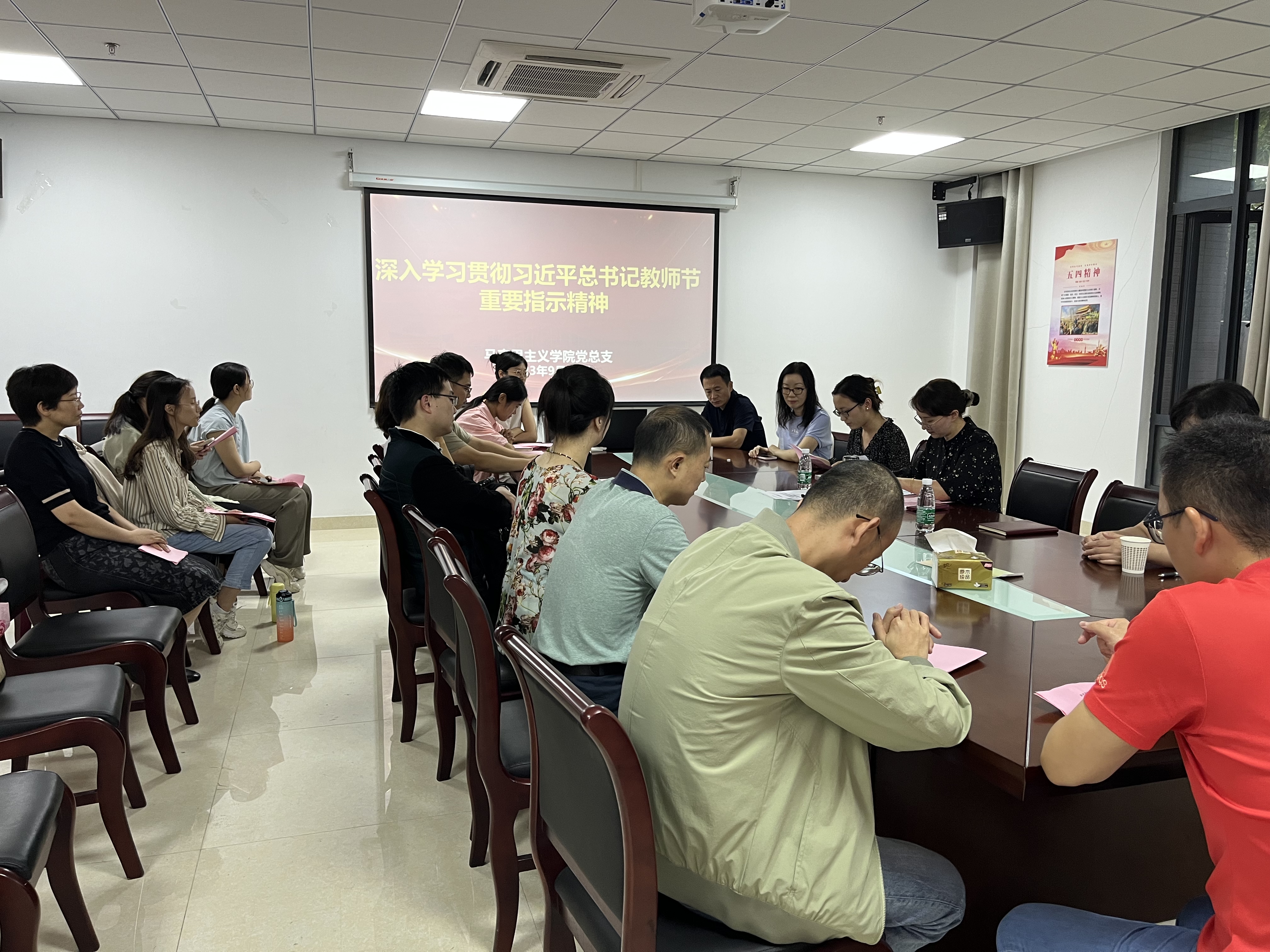 在第三十九个教师节到来之际,习近平总书记致信出席全国优秀教师代表座谈会的各位老师,代表党中央,向他们和全国广大教师及教育工作者致以节日的问候和诚挚的祝福。9月13日下午,马克思主义学院教师在尚真楼110会议室,开展专题理论学习,深入学习贯彻习近平总书记教师节重要指示精神,结合教育教学实际,畅谈对教育家精神的重要意义、丰富内涵的认识和理解。大家表示要不负习近平总书记的殷殷嘱托,大力弘扬教育家精神,自信自强、踔厉奋发,用大爱书写教育人生,以仁爱之心乐教爱生。