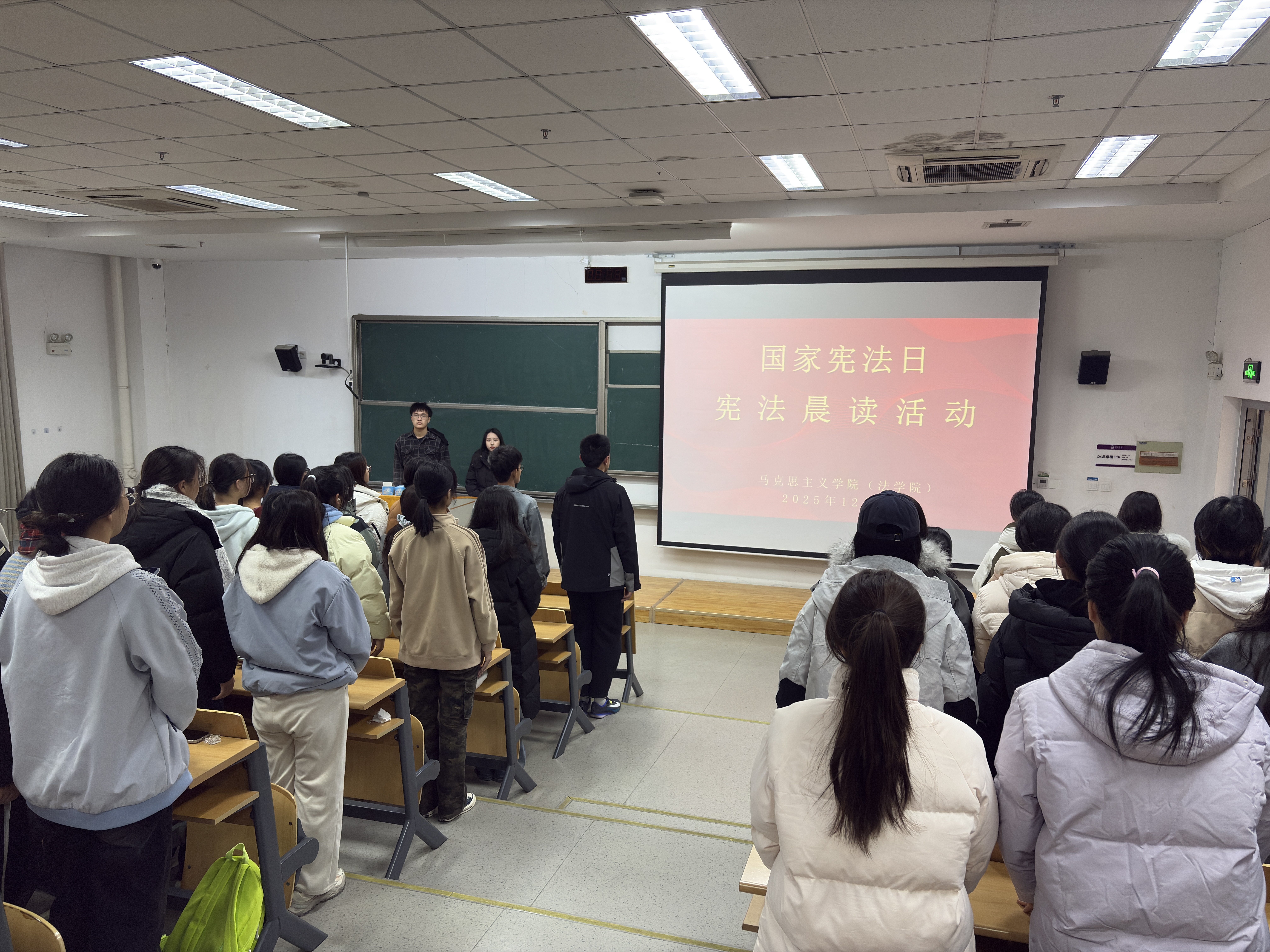 上午,法学院各班级组织学生开展宪法晨读活动。同学们精神饱满、情绪高昂,齐声诵读宪法部分章节,认真领会宪法精神。随后,大家通过教育部青少年普法网集中观看了国家宪法日“宪法晨读”活动直播,进一步学习宪法知识、感受宪法力量。