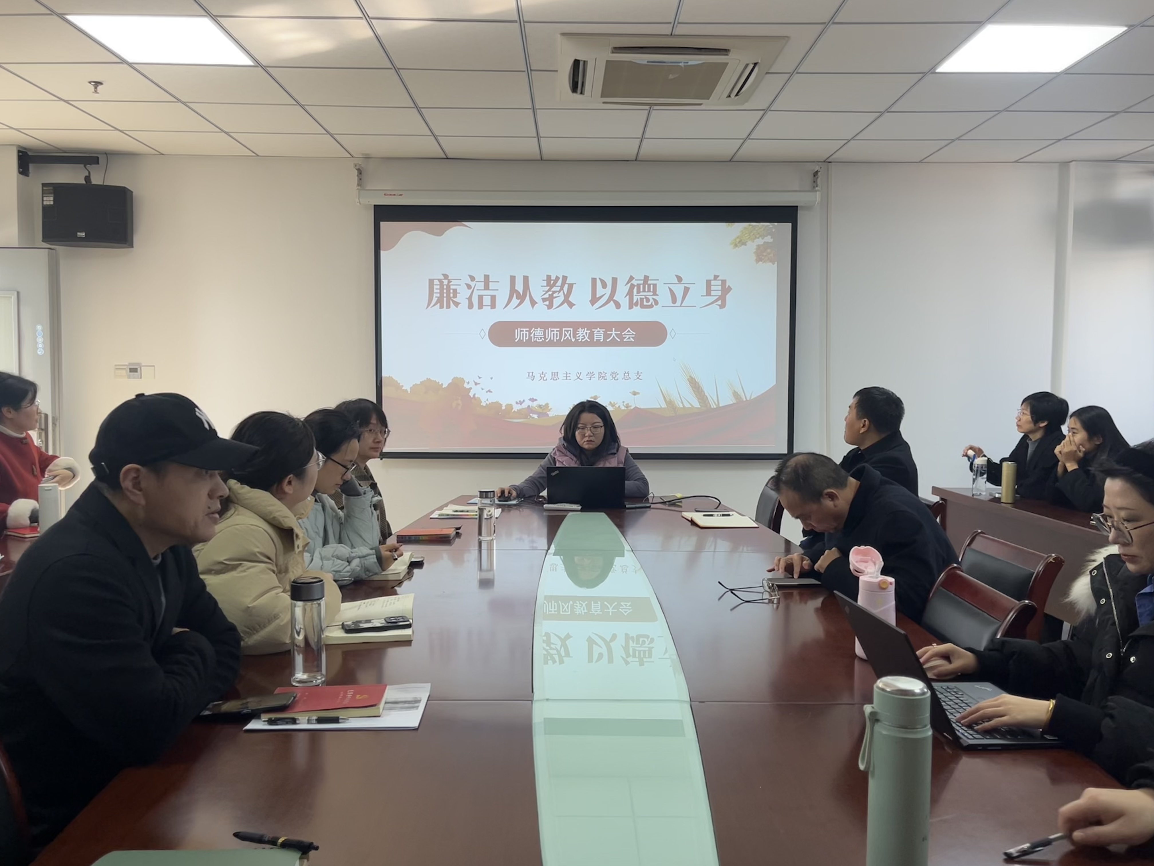 近日,马克思主义学院党总支在尚真楼511会议室召开师德师风专题会议。此次会议旨在进一步强化全院教职工的师德修养,筑牢廉洁从教思想根基,会议由学院党总支副书记王琳琳主持,全体教职工参会,共同聚焦师德师风建设核心议题。