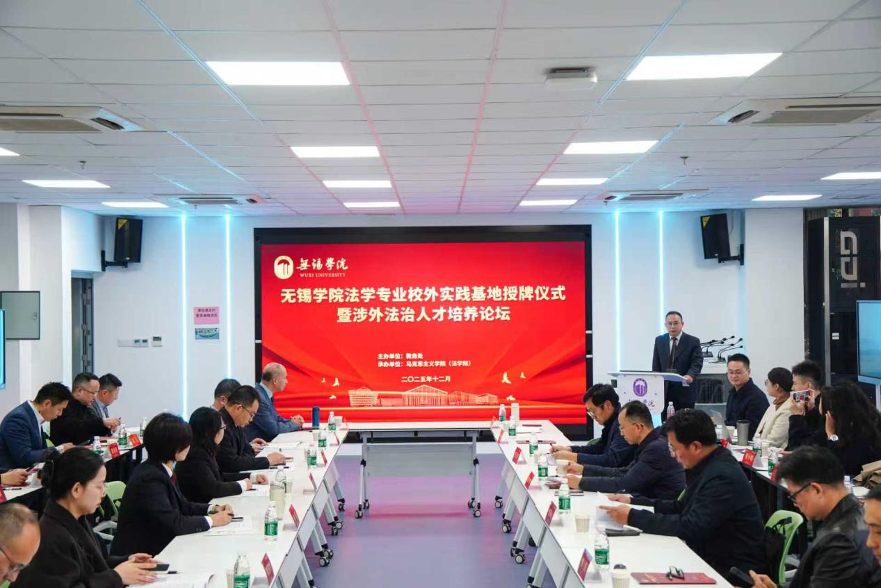 为深入学习贯彻习近平法治思想,落实加强新时代法学教育和法学理论研究的要求,探索法学院系与法治实务部门协同育人机制,12月9日下午,无锡学院举办法学专业校外实践基地授牌仪式暨涉外法治人才培养论坛。校党委副书记匡辉出席活动。活动邀请无锡市中级人民法院、市人民检察院、市律师协会、市无锡仲裁委员会等法律实务部门及省内外高校的专家学者来校,与学校教务处、教师发展与教学评估中心等相关部门负责人和法学院师生代表共同聚焦涉外法治人才培养与实践教学创新,共话校地协同育人新路径。活动由马克思主义学院(法学院)副院长张运书主持。