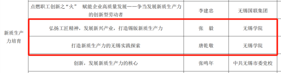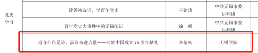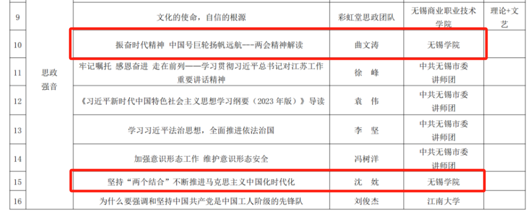 近日,无锡教育传媒发布了2024 年“新时代 新思想 新宣讲”暨“劳模工匠进校园 思政教师进企业 ”活动课单,经马克思主义学院和校工会遴选,我院沈妉、曲文涛入选“思政强音”课单,张毅、唐乾敬入选“新质生产力培育”课单,李倩楠入选“党史学习”课单。这五位老师将在无锡市总工会的组织协调下,为各市(县)区、经开区总工会,各局(公司)、直属单位工会讲授党的最新理论、解读时事政策。