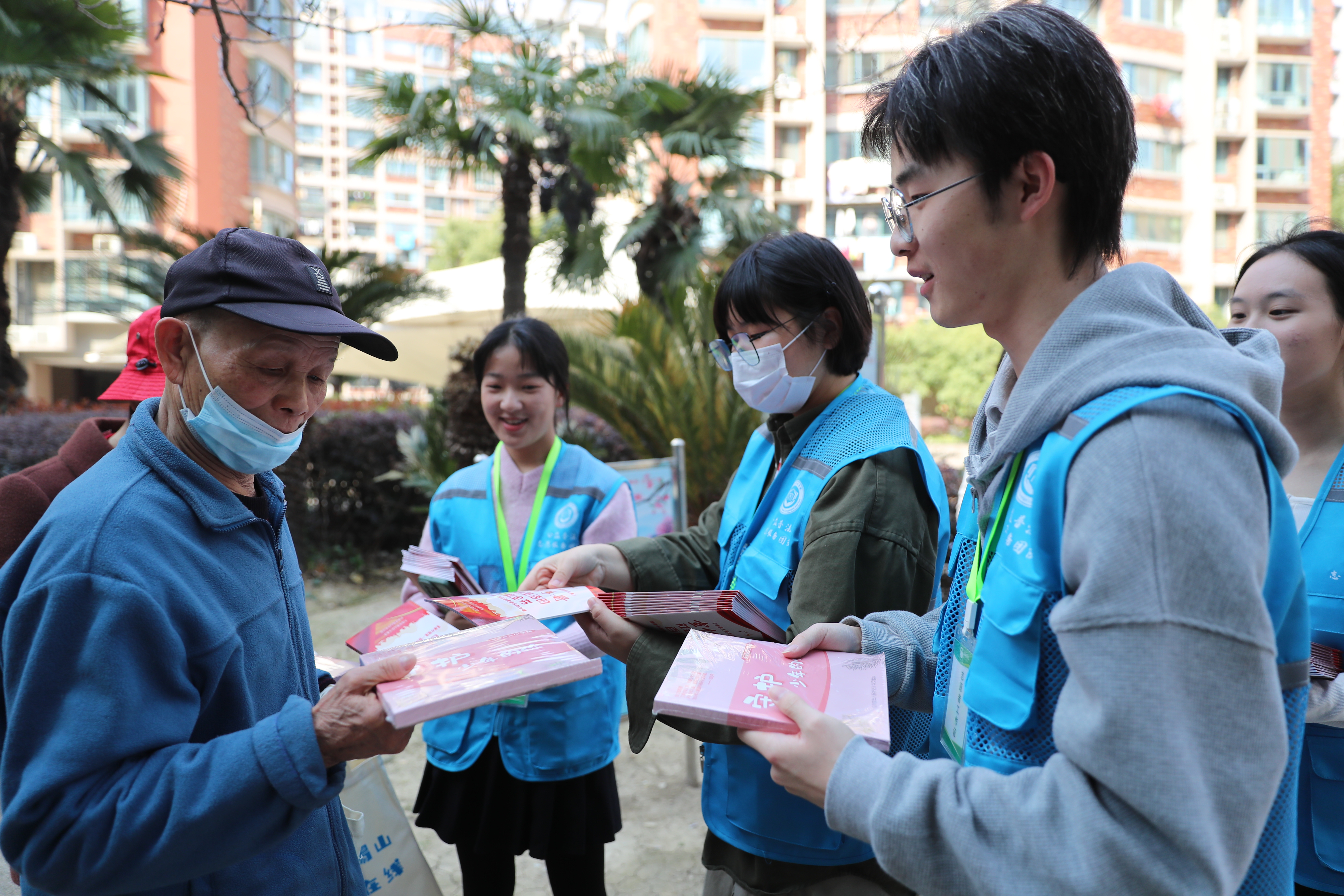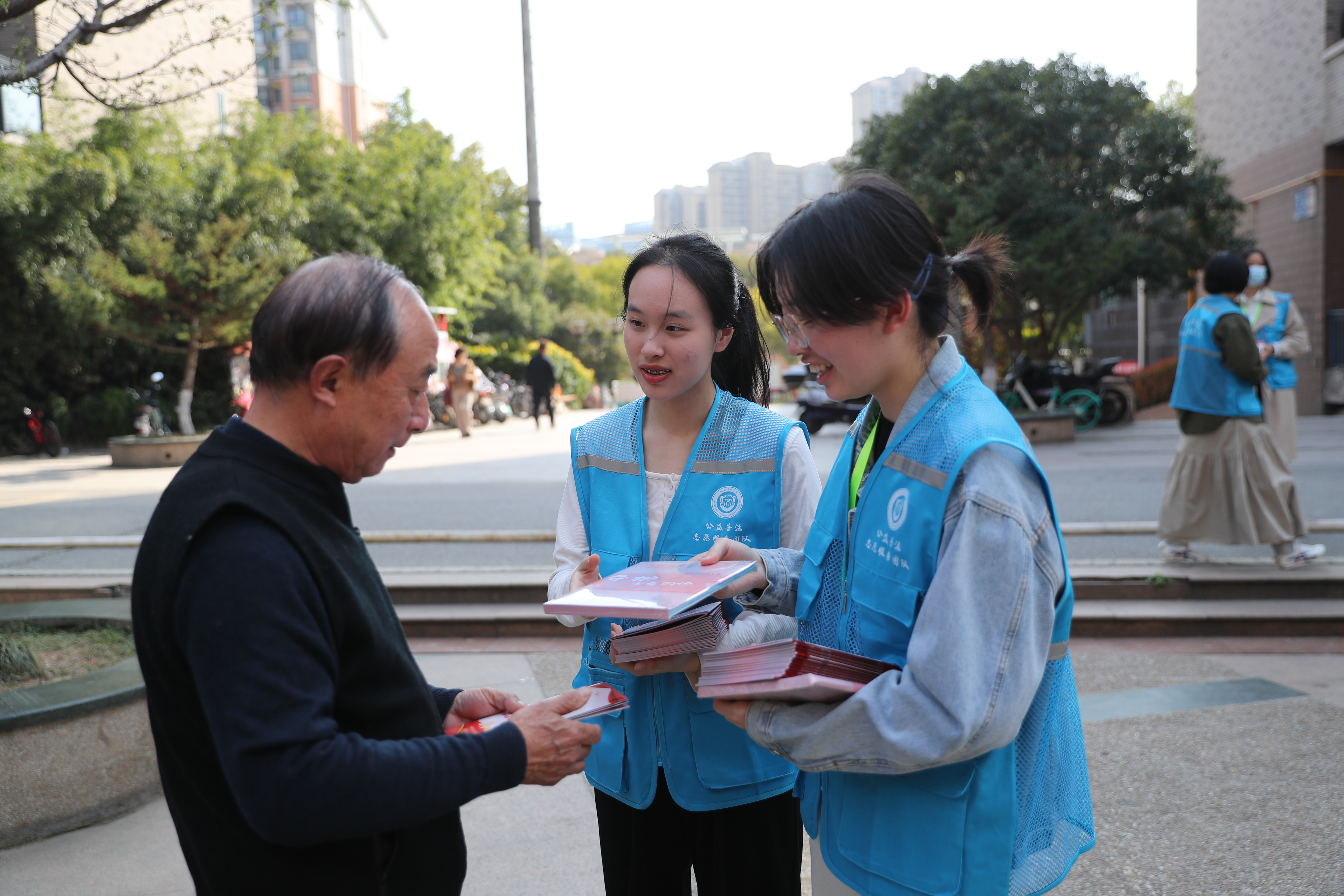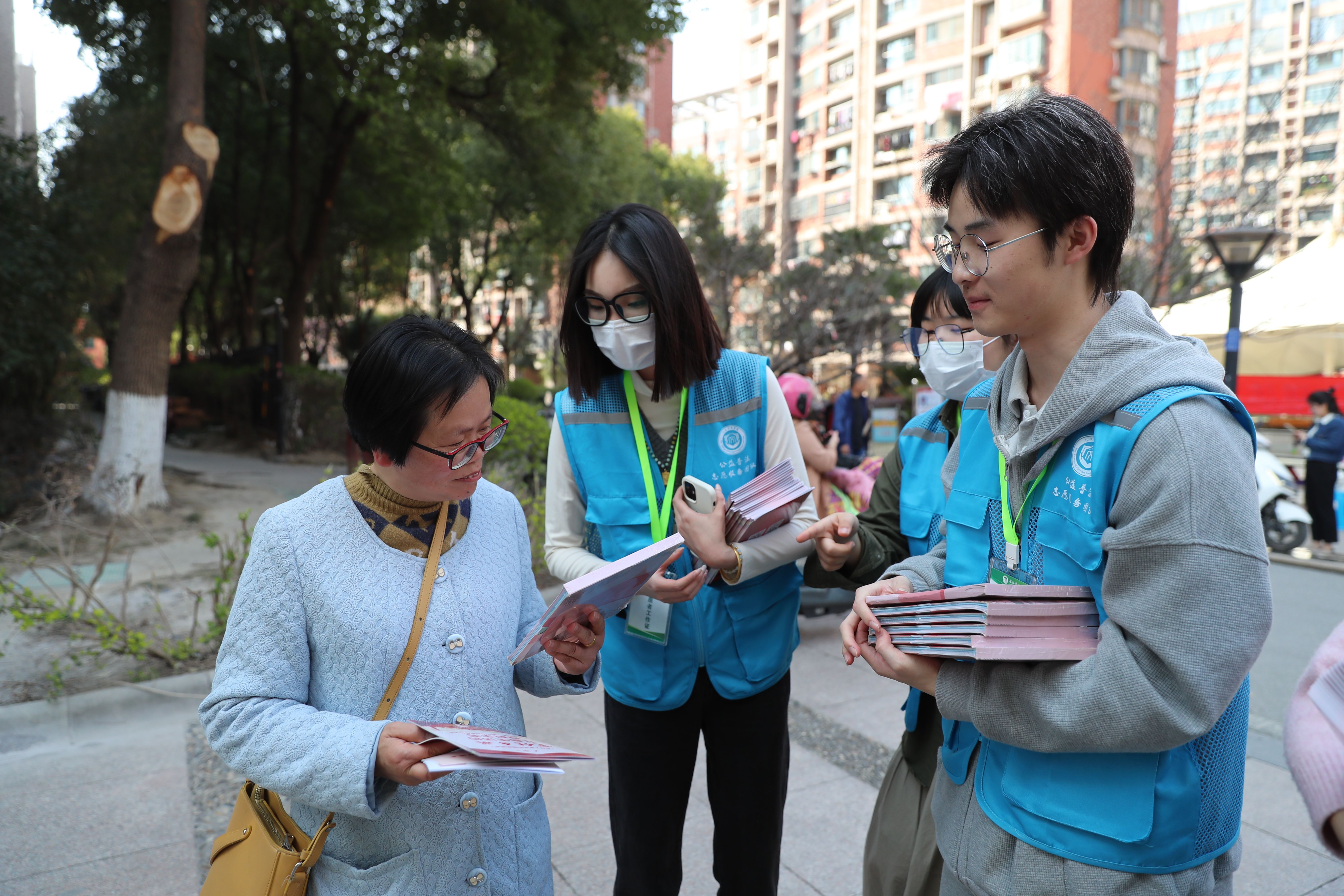 熙熙攘攘的社区广场上,志愿者们与青年检察官支起了法治宣传摊位,向社区居民发放了民法典、未成年人保护手册等法治宣传资料。