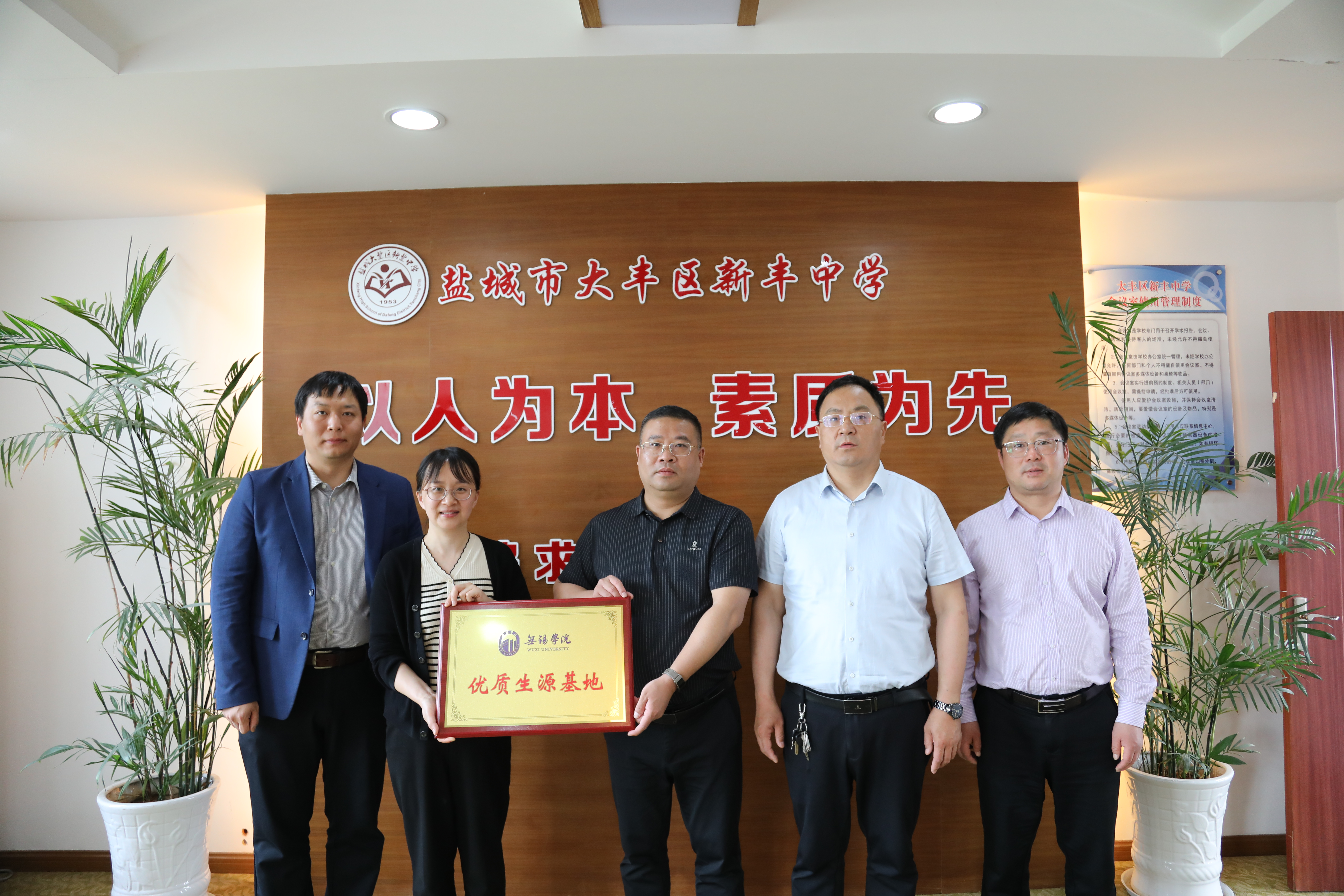 为持续提升我校本科生源质量,进一步广泛宣传学校办学特色和专业优势,5月17日,马克思主义学院副院长沈妉带队赴盐城市大丰区新丰中学开展交流并举行“优质生源基地”授牌仪式,马克思主义学院教研室主任赵超、办公室副主任陆力文、教学秘书毛君澜随行。新丰中学的校领导出席活动。