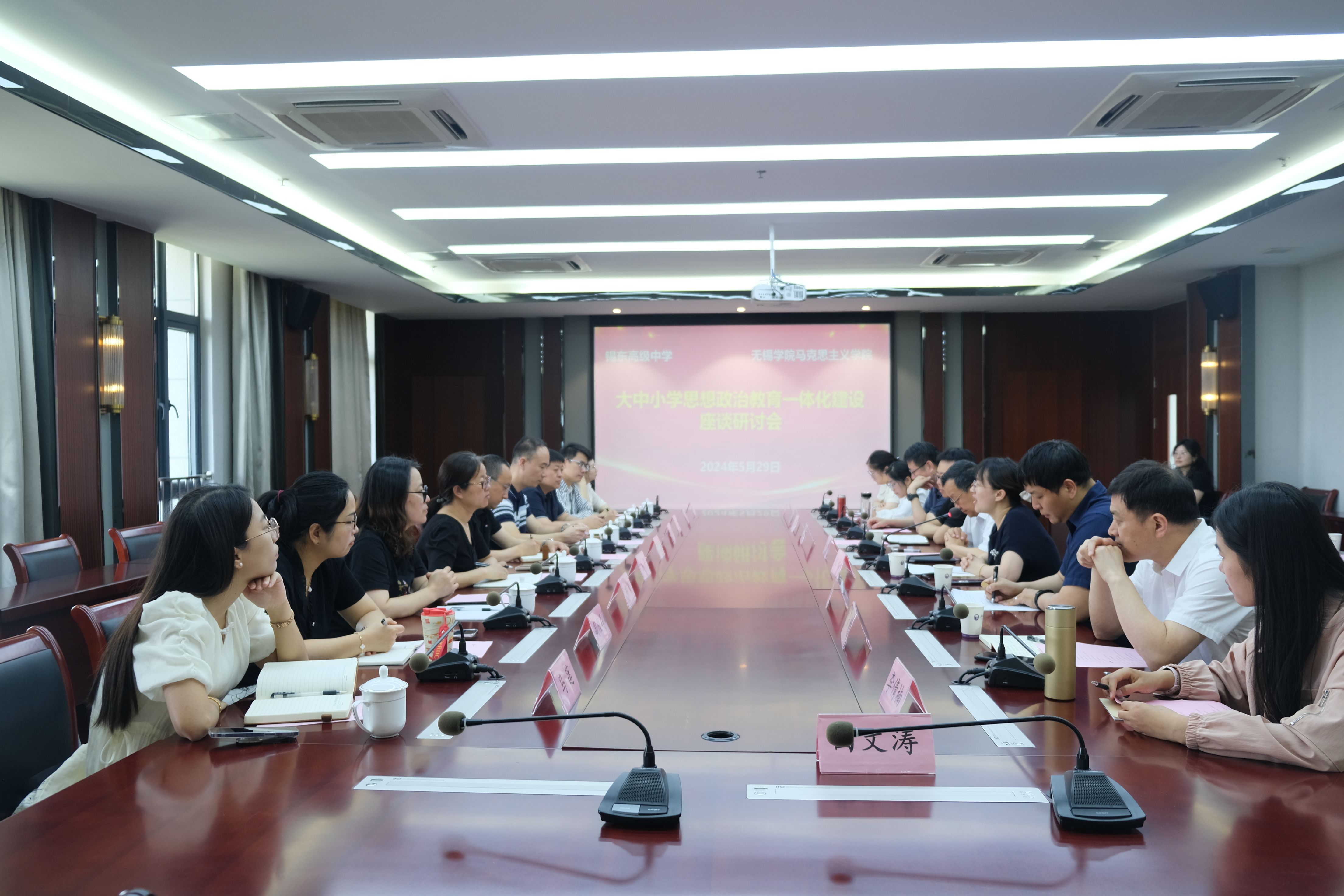 5月29日上午,马克思主义学院与锡东高级中学大中小学思想政治教育一体化建设座谈研讨会在行政楼525召开。锡东高级中学党总支副书记、副校长谢晓丰、学生发展中心主任华滨等一行九人来我校调研交流。我校校工会副主席、图书馆馆长安杰、校学工处副处长林峰、马克思主义学院全体教师参加座谈交流,会议由马克思主义学院副院长沈妉主持。